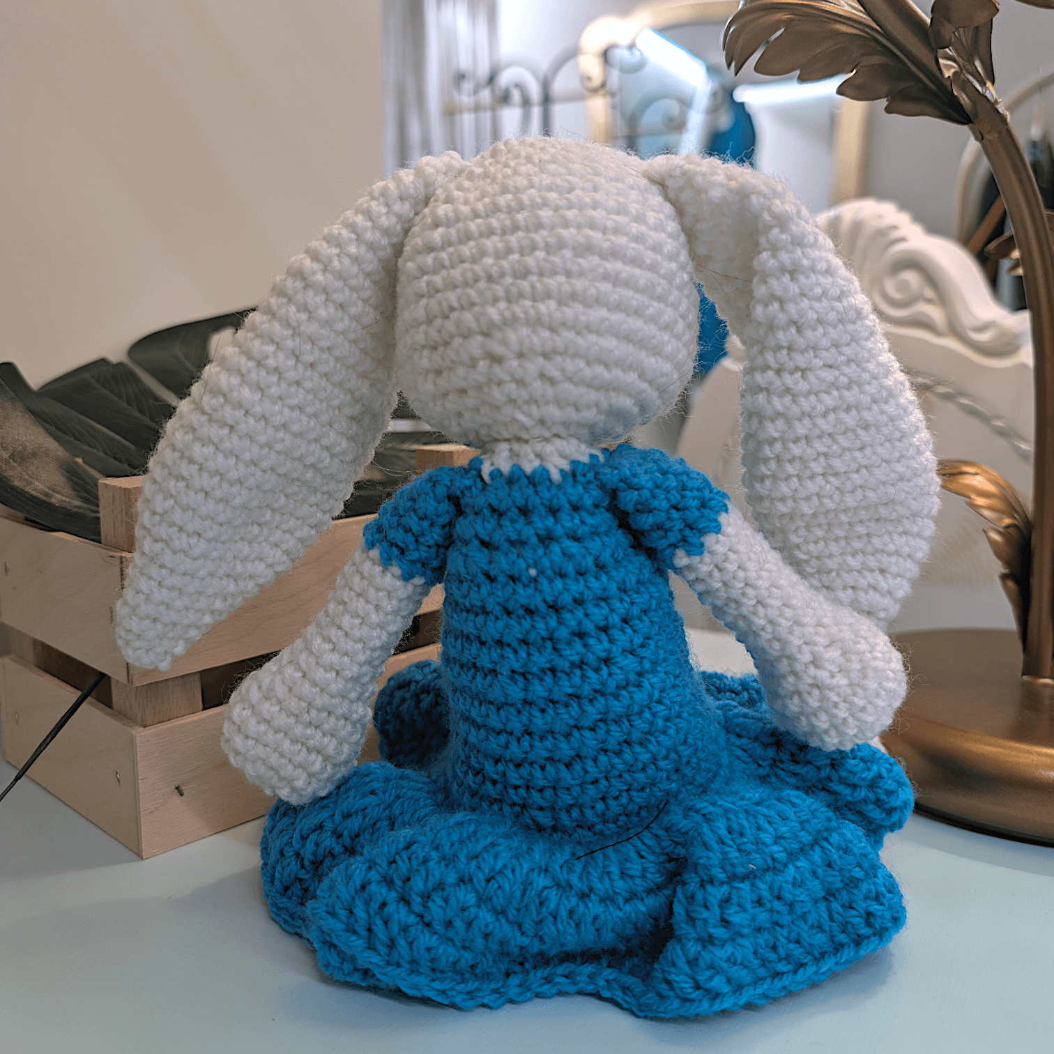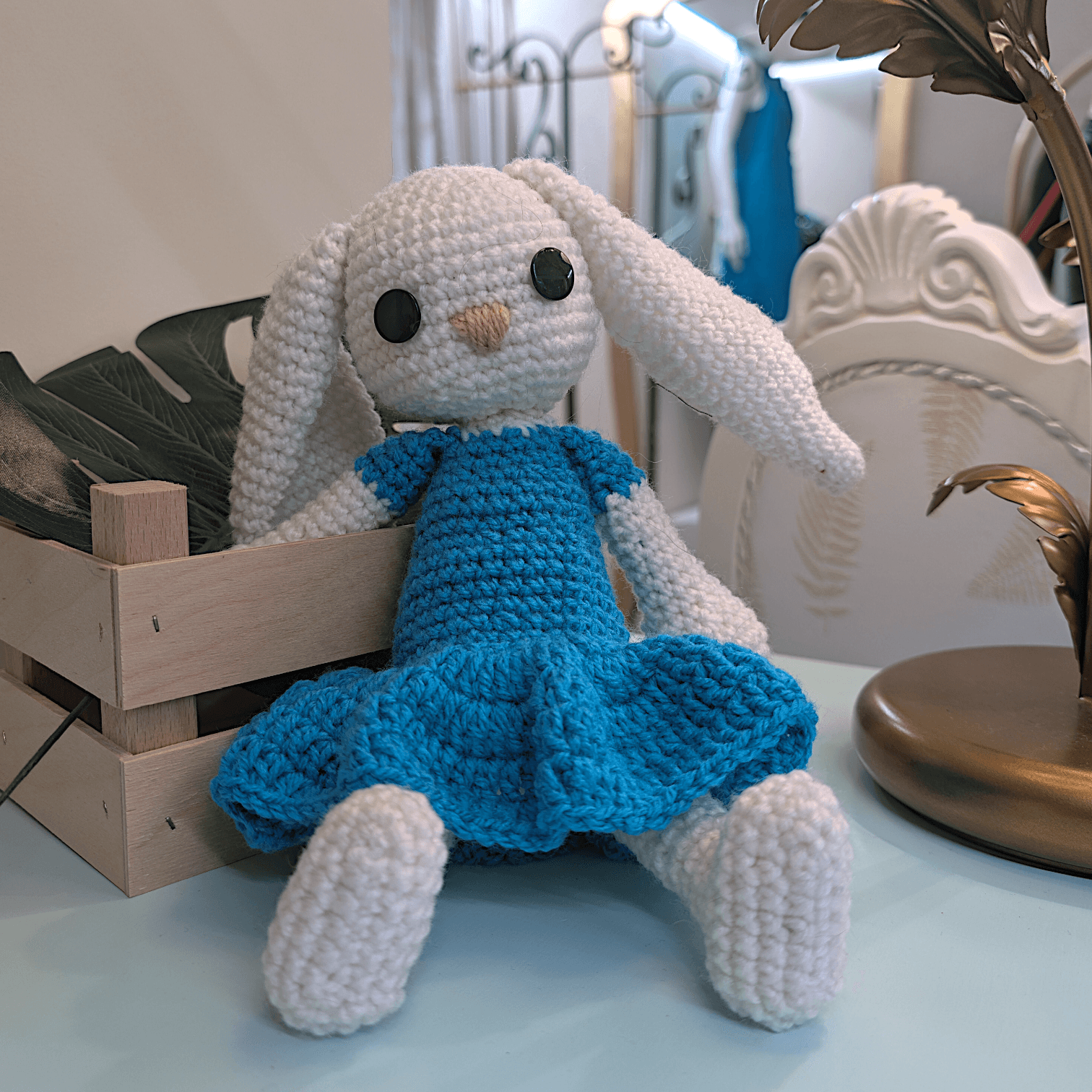 Questa coniglietta amigurumi è realizzata interamente a mano all’uncinetto, con corpo soffice, orecchie lunghe e morbide e un vestitino lavorato a mano che dona movimento e carattere. Il contrasto tra il bianco delicato e l’abitino colorato la rende elegante ma tenera allo stesso tempo.